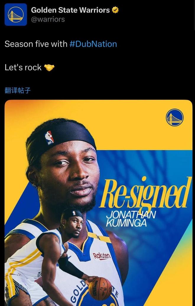 Shams:库明加两年4850万续约勇士 第二年为球队选项